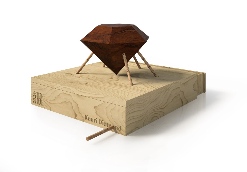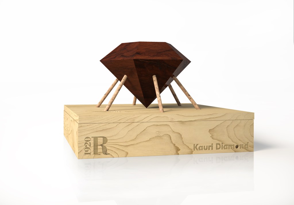 Il progetto sublima la ricchezza del legno Kauri in una forma, quella del diamante, che è sinonimo di ricercatezza, di unicità, di prestigio.
