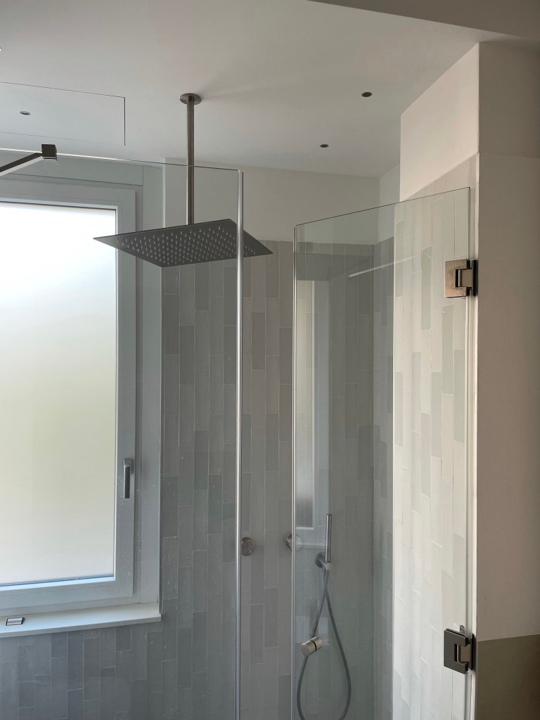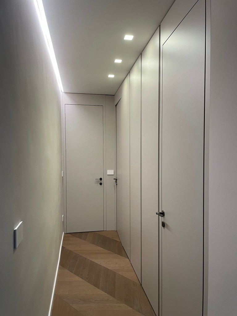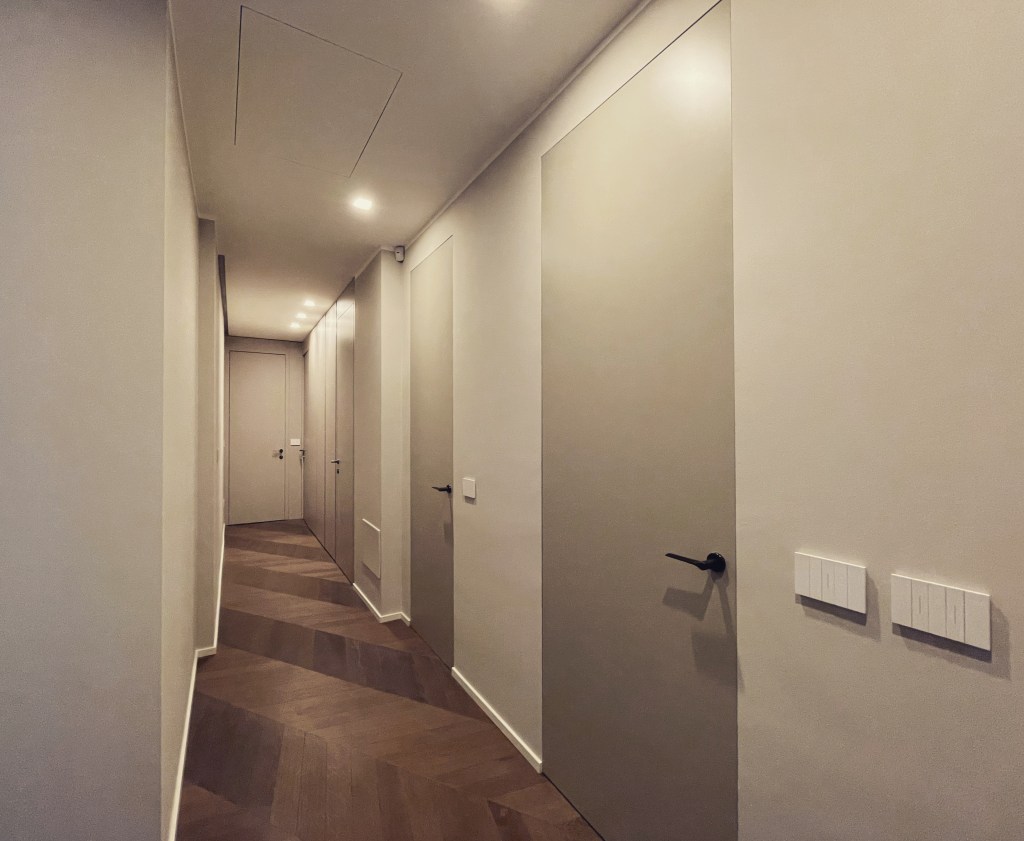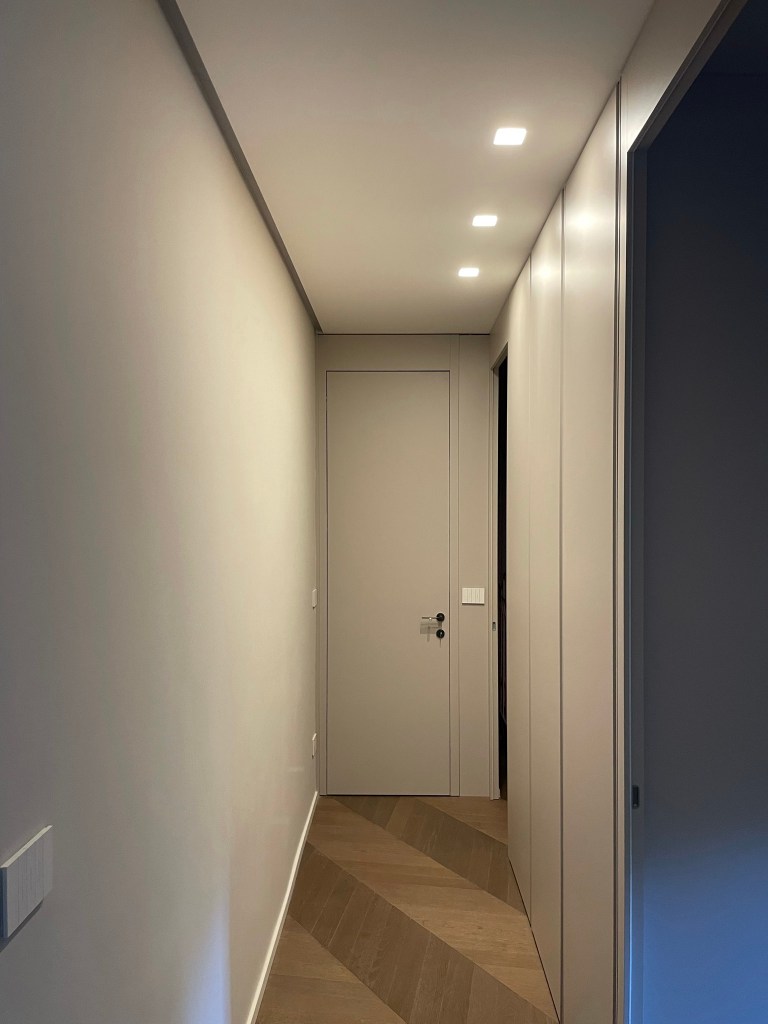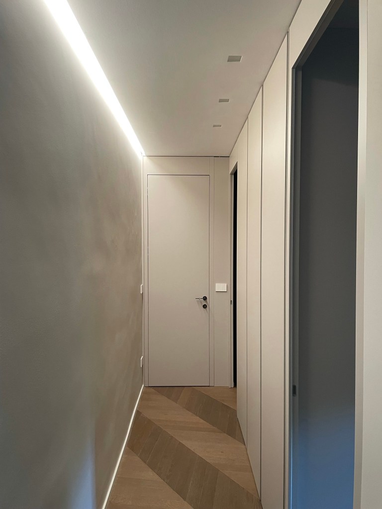 Porte a tutta altezza a filo muro, maniglie Olivari modello Lama disegnate da Gio Ponti, parquette a spina ungherese, cucina Modulnova, illuminazione Flos, TOOY, Foscarini.
